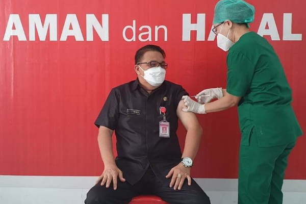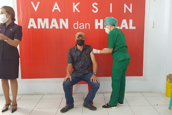 Kepala Dinas Komunikasi dan Informatika (Kominfo) Kabupaten Minahasa Agustivo Tumundo SE MSi, di Vaksin Sinovac bersama dengan beberapa Wartawan Biro Kabupaten Minahasa, pada senin 8 maret 2021, bertempat di RSUD Sam Ratulangi Tondano.
