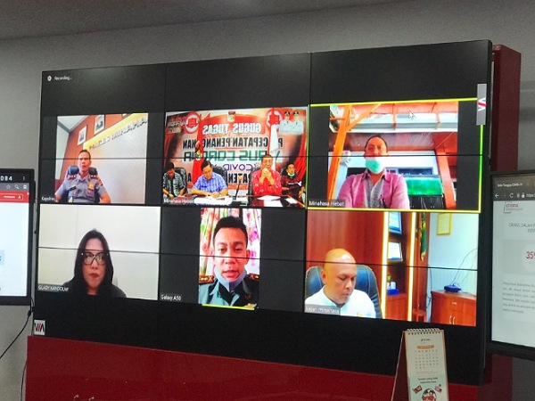 Turut dalam video conference, Sekretaris Daerah Kabupaten Minahasa Frits Muntu, SSos, Ketua DPRD Kabupaten Minahasa Glady Kandouw SE, Kapolres Minahasa AKBP Denny Situmorang, SIK, Dandim 1302 Minahasa Letkol Inf. Slamet Raharjo SSos MSi, Kajari Minahasa Rahmat Budiman Taufani, SH, MKn, Asisten Pemerintahan dan Kesra Dr Denny Mangala MSi, Asisten Perekonomian dan Pembangunan Ir Wenny Talumewo, Kepala BPKAD Drs. Hanes D. Wagey, MBa, Kepala Dinas Kesehatan dr. Maya Rambitan, MKes, Kepala Dinas Kesbangpol Ir Janny Moniung, Kepala Bagian Protokol dan Komunikasi Pimpinan Maya Kainde, SH, MAP, Kepala Bagian Umum Lona Wattie, SSTP, Kepala Bagian EKonomi dan SDA Grace Maindoka.