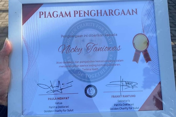 Aksi Heroik Pemadam Kebakaran Kabupaten Minahasa mendapat Apresiasi dari Golden Charity For Sulut. Apresiasi ini diberikan kepada Nicky Taniowas yang Mengevakuasi peliharaan anjing saat terjadi kebakaran di Pusat pertokoan Kota Tondano belum lama ini.