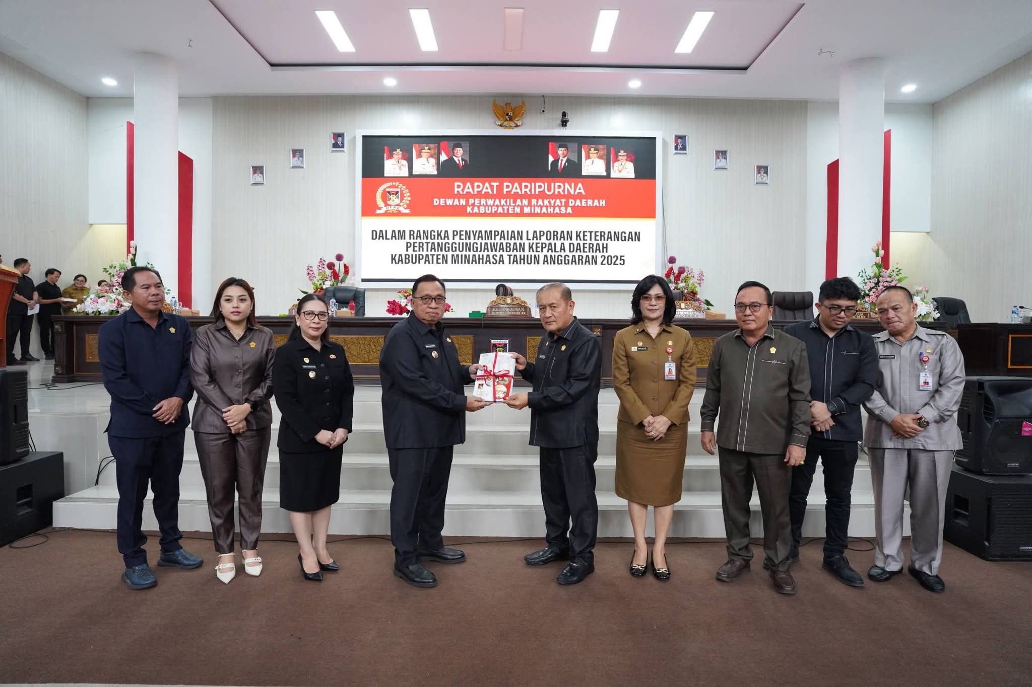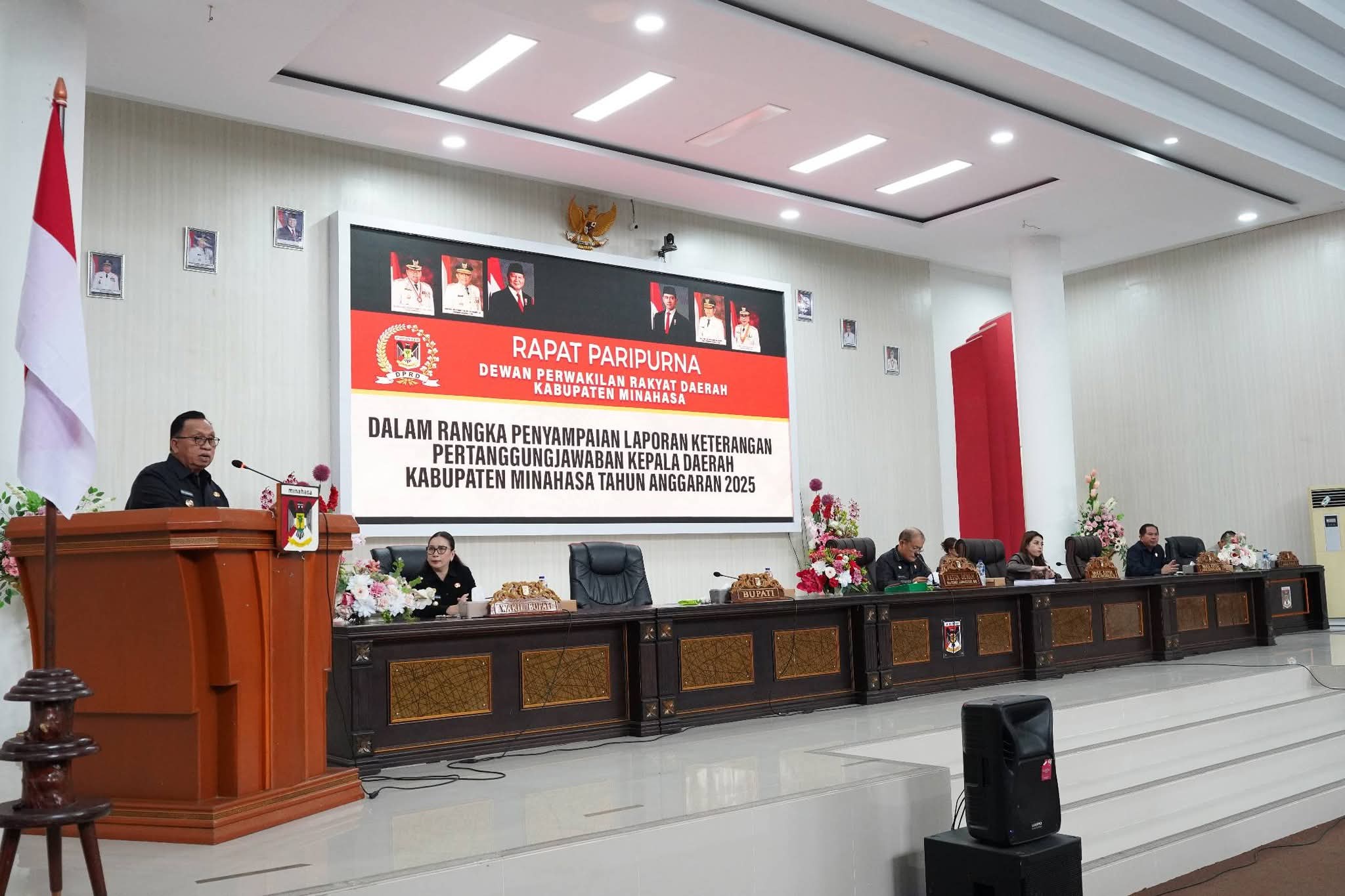 Dokumen LKPJ diserahkan langsung oleh Bupati Minahasa Robby Dondokambey, yang dalam sambutannya memaparkan data Badan Pusat Statistik (BPS) tahun 2026 yang menunjukkan pertumbuhan ekonomi Kabupaten Minahasa berada pada angka 5,58 persen, naik dari 5,49 persen pada tahun 2024. Angka kemiskinan turun menjadi 5,88 persen dari sebelumnya 6,53 persen pada 2024.