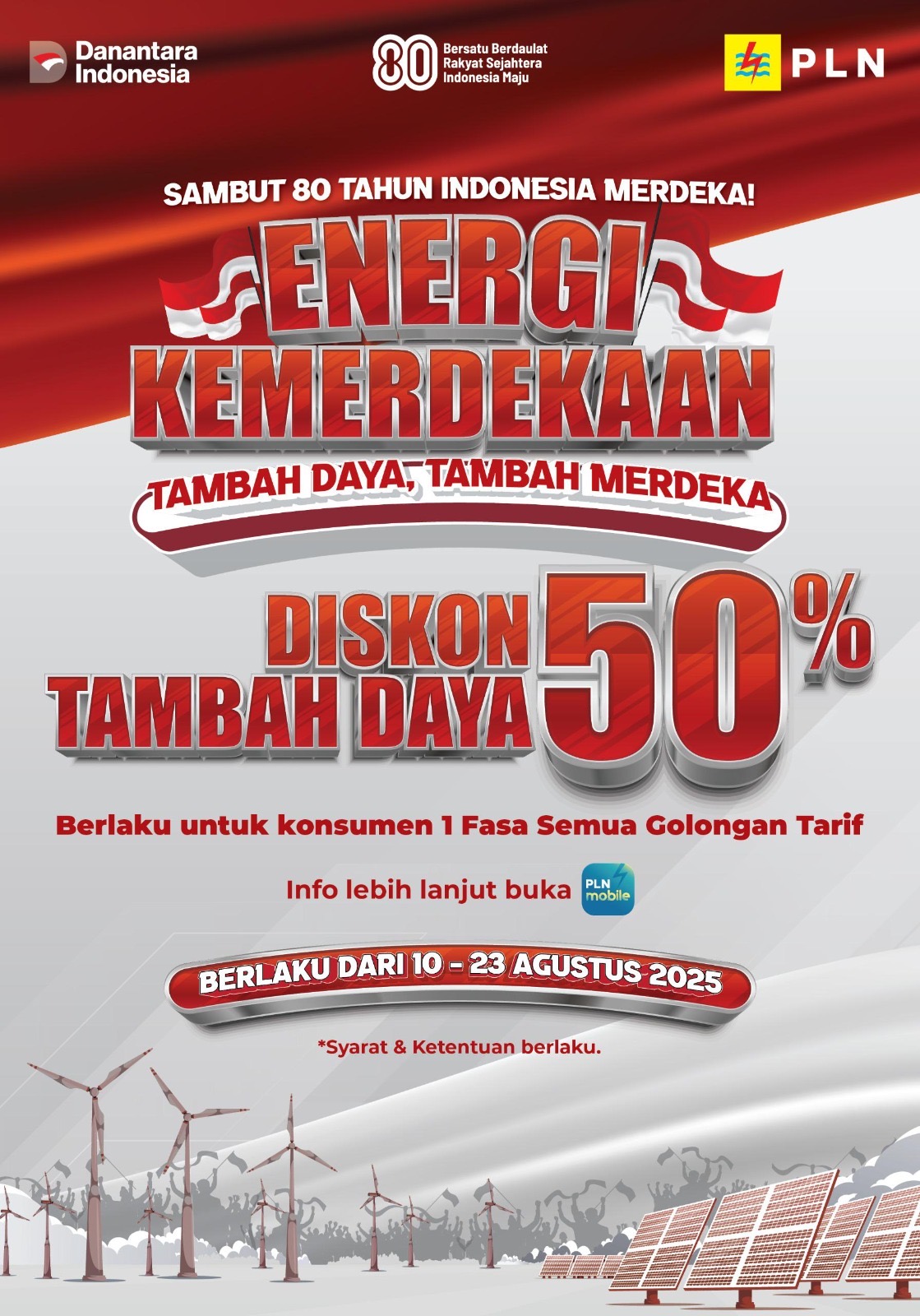 Dalam rangka menyemarakkan Hari Ulang Tahun ke-80 Kemerdekaan Republik Indonesia, PT PLN (Persero) menghadirkan program spesial bertajuk “Energi Kemerdekaan”. Melalui program ini, pelanggan dapat menikmati diskon tambah daya listrik 50% yang berlangsung mulai 10 hingga 23 Agustus 2025.