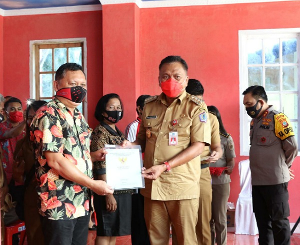 Bupati Minahasa Dr. Ir. Royke Octavian Roring MSi bersama Wakil Bupati Robby Dondokambey SSi, mendampingi Gubernur Sulawesi Utara Olly Dondokambey SE, Pada Acara Penyerahan Sertifikat Pendaftaran Tanah Sistematis Lengkap (PTSL) bagi Masyarakat Kabupaten Minahasa. Pada Senin 14 September 2020, di Desa Tambala Kecamatan Tombariri.