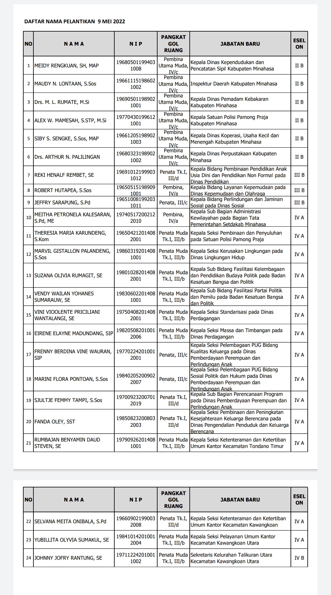 Wakil Bupati Minahasa Dr. (Hc) Robby Dondokambey SSi, melantik Pejabat Esalon 2, 3 dan 4 , pada senin 9 Mei 2022 bertempat di Aula Benteng Moraya Tondano. Berikut Nama Nama Yang Dilantik.