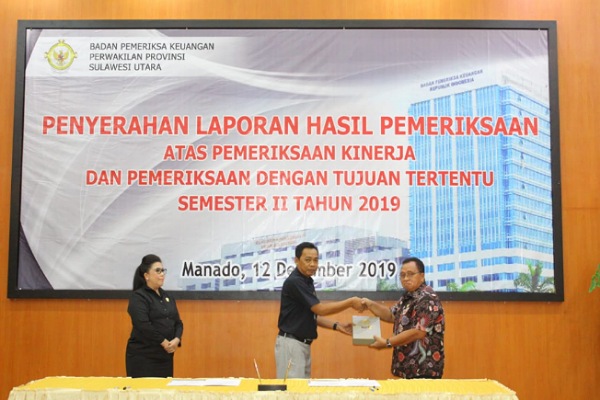 Wakil Bupati Minahasa Robby Dondokambey SSi di dampingi Sekretaris Daerah Kabupaten Minahasa Ir Ronald Sorongan MSi Menghadiri Acara Penyerahan Laporan Hasil Pemeriksaan Atas Pemeriksaan Kinerja dan Pemeriksaan Dengan Tujuan Tertentu Semester II Tahun 2019 di Kantor BPK RI Perwakilan Prov. Sulawesi Utara, pada Kamis, 12 desember 2019.